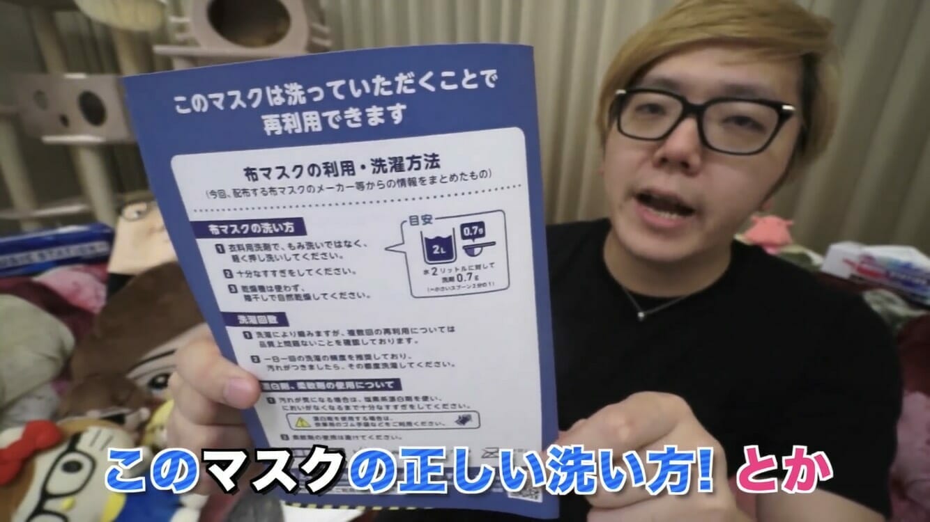ひとしきり誕生日を祝った後、ついにアベノマスクを開封するヒカキン。見た感じはそんなに小さくなさそうだ。開封してみると、アベノマスクの洗い方や3密に気をつける行動の仕方など説明書きが同封されていた。使い捨てマスクはすぐに捨ててしまうので、このような繰り返し洗えるマスクはありがたいと話していた。