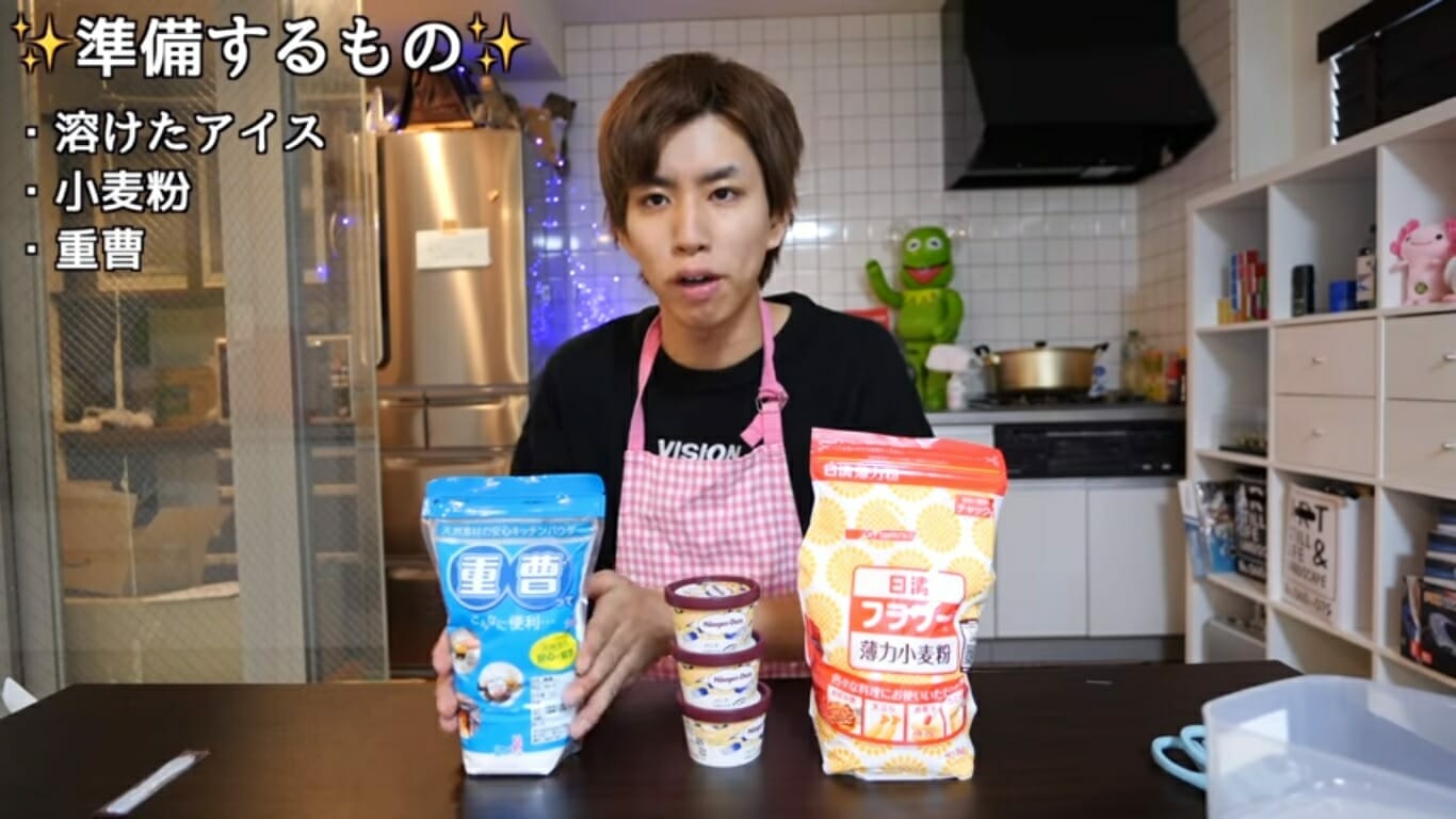 はじめしゃちょーは、溶かしたアイスと小麦粉に重曹を用意して、パンを作る実験に挑戦した。アイスに小麦粉と重曹を加えて、レンジで温めると蒸しパン風の生地が完成した。味はそれなりだったが、想像とは違っていたようで「二度とやらん」と語った。