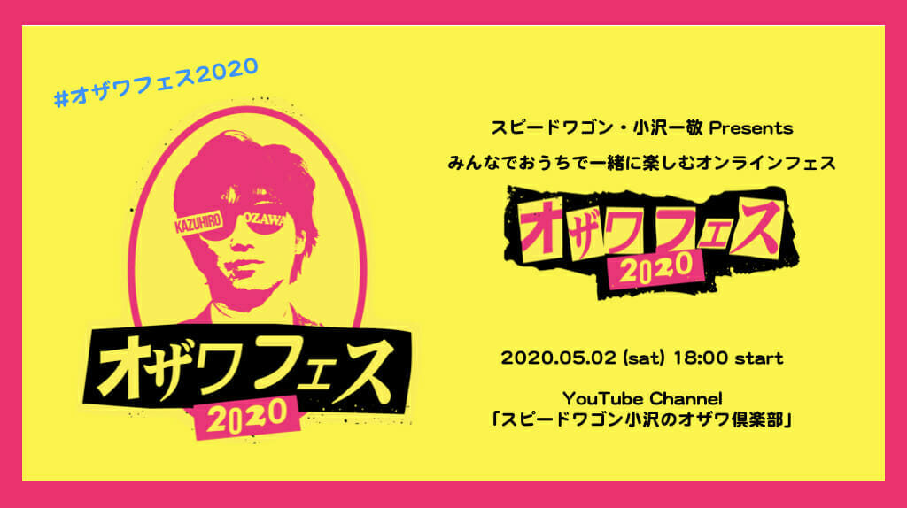 YouTubeでも活動中の人気芸人 スピードワゴンの小沢一敬が自身のYouTubeチャンネル「スピードワゴン小沢のオザワ倶楽部」にて、オンラインフェス「オザワフェス2020」を5月2日(土)に急遽開催することを発表した。