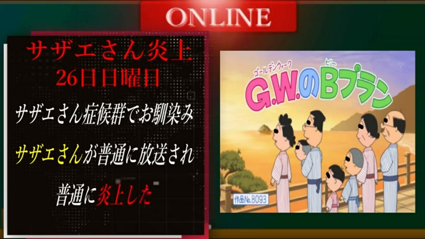 2020年4月30日、ラジオ系YouTuberのたっくーTV(たっくーTVれいでぃお)が「【サザエさん炎上】イライラし過ぎだろお前ら」という動画を投稿した。コロナ自粛で気持ちがネガティブになりやすい最近の炎上事件をまとめた。