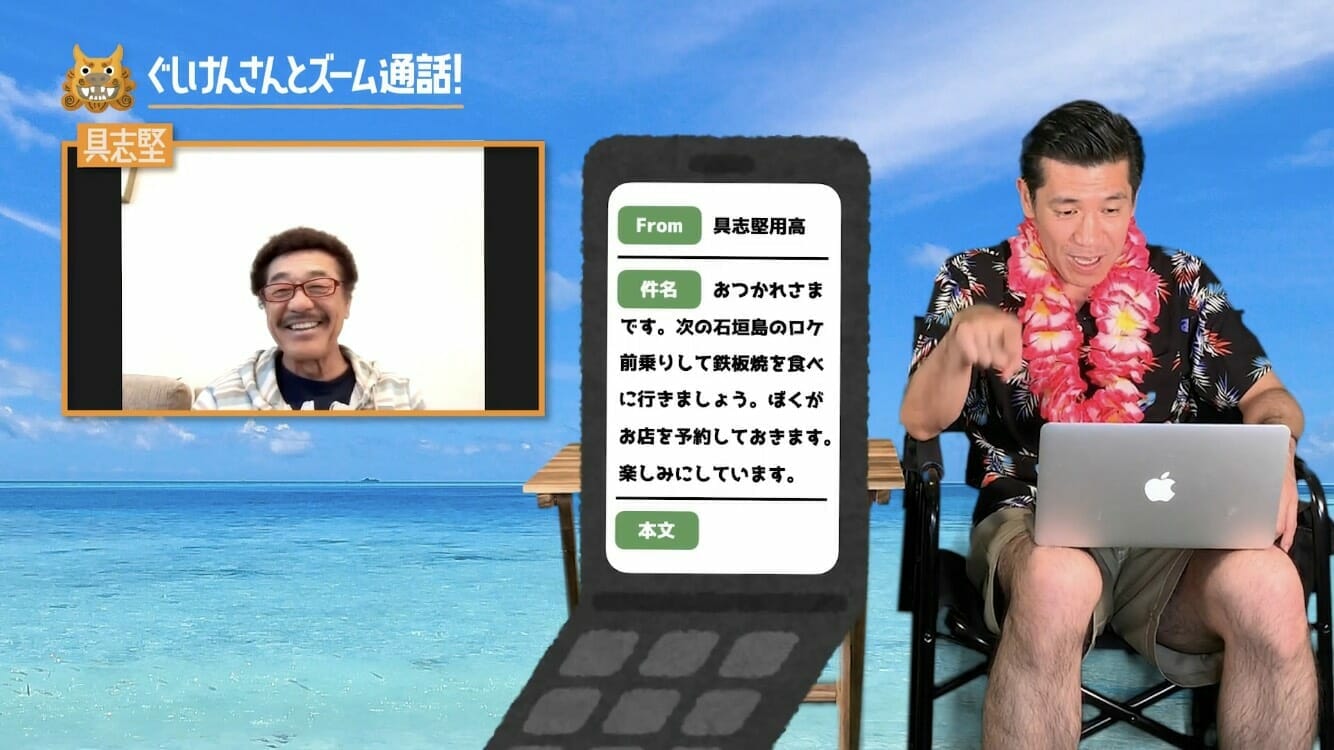 初回の動画を投稿したゴリ。記念すべき初回動画のゲストは、同じく沖縄出身のスター・具志堅さんだ。テレビ電話で具志堅さんと電話を始めたゴリは、和やかなムードで沖縄らしい会話を展開していった。