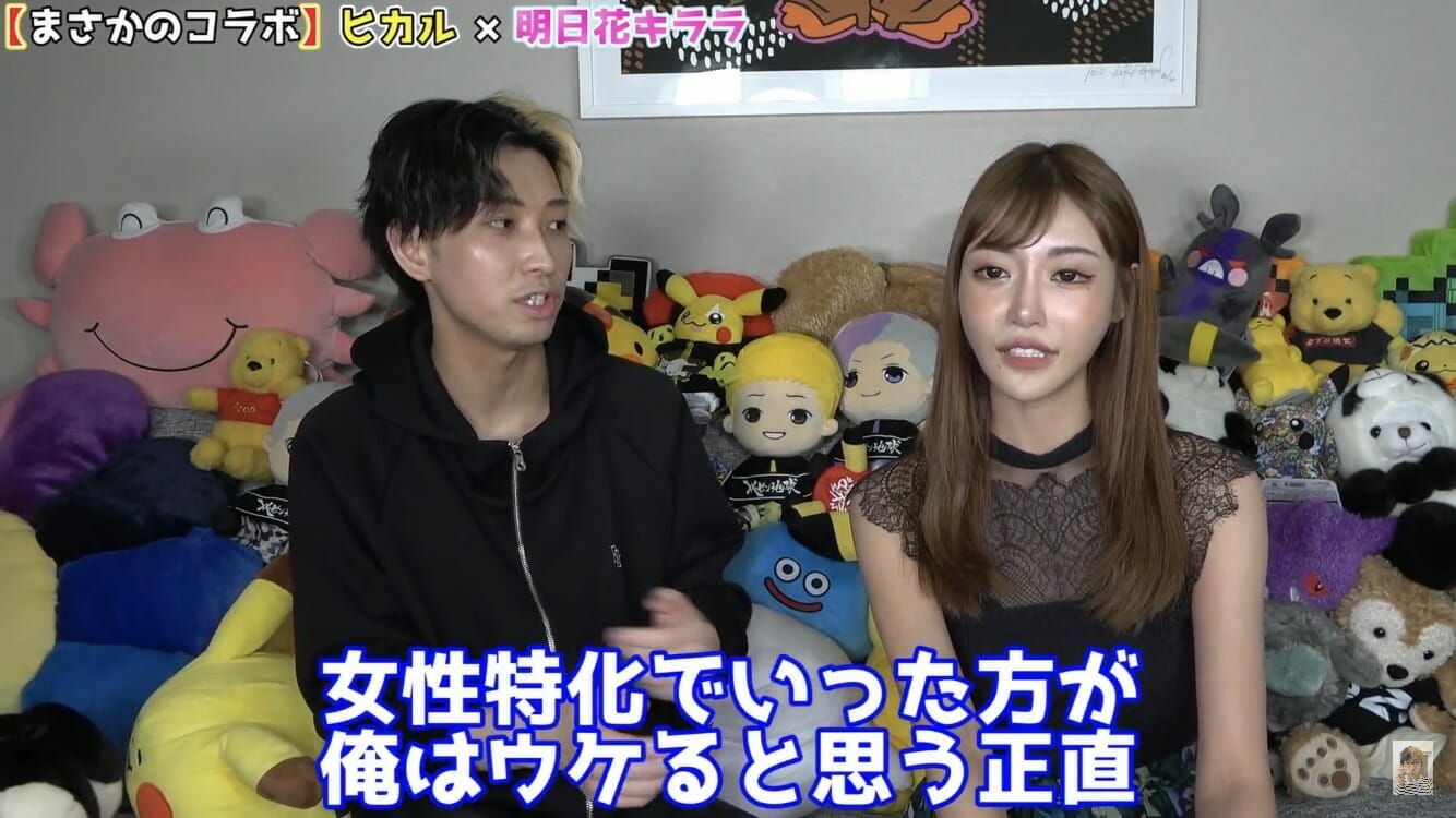 男性にも女性にも人気がある明日花キララ。しかしヒカルはYouTubeに関していうと男性向けのアダルトな内容ではなく、女性向けのYouTubeチャンネルにした方が良いとアドバイスをした。SNSでも女性ファンを多く獲得し、美容法などが注目されていて女性の憧れになっている明日花キララ。女性目線の方が長く続くと答えた。