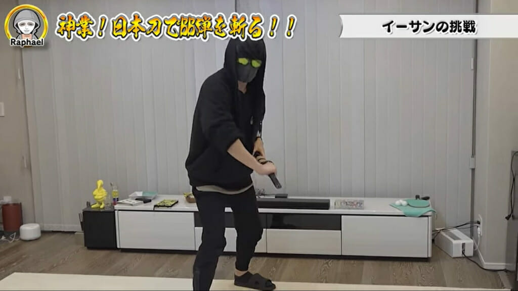 体を張る企画をまたしてほしいとの声が多いラファエル。今回はそんなリクエストに答える形で、日本刀を使った企画を行った。日本刀の資格を持つラファエルだからチャレンジ出来る挑戦である。