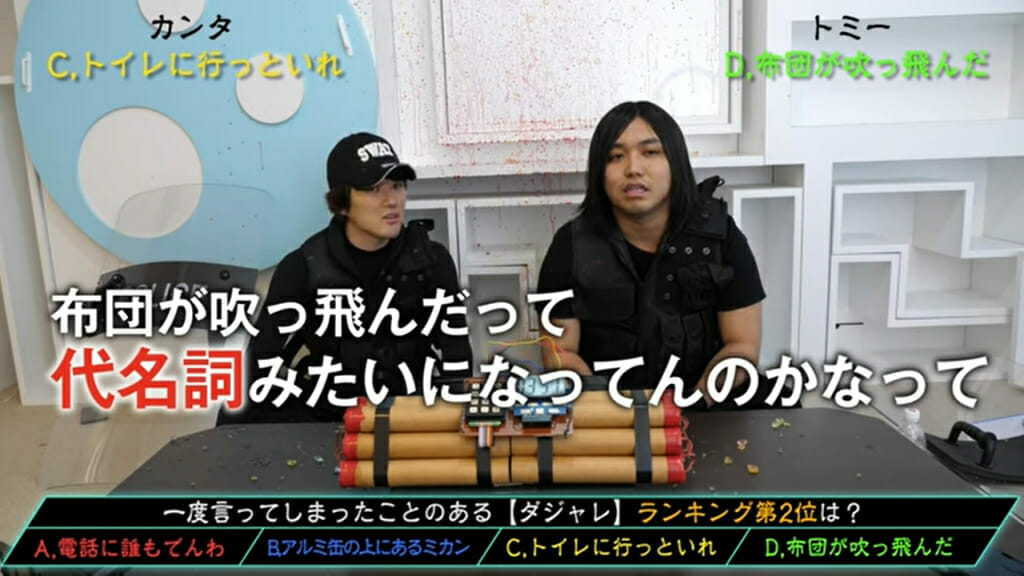 トミーとカンタは爆弾処理班に変装。机の上にある爆弾を処理すべく8問の問題に挑戦。問題に正解しないと爆発していく時限爆弾。爆発に怯えながらも進めていくトミーとカンタに注目の動画となっている。