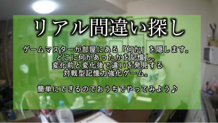 - 「リアル間違い探し」は、ゲームマスター(凸)が部屋にある何かを隠し、プレイヤー(だいちぃ・やふへゐ)は部屋のどこに何があったかという記憶から、変化している部分を発見するという対戦型記憶力強化ゲームなのだ。