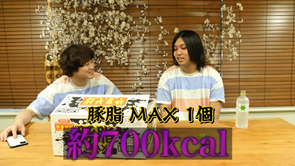 水溜りボンドは「豚脂MAXペヤングの早食い」に挑戦。豚脂MAXペヤングはパッケージに「胸焼けに注意」と書いてあり、早食い・大食いには向いていない食材である。それを食べる→寝るを続けた時のタイムを出す企画となっている。