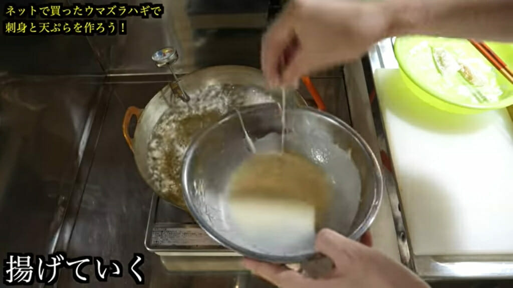 ウマヅラハギのお刺身と肝の天ぷらを作っていくきまぐれクック。いつものように慣れた手付きで魚を捌き、3枚におろしていく。天ぷらとお刺身を作っていざ実食へ。鮮度の良い肝とのことで、肝をたっぷり使った肝醤油でお刺身も食べ進めている。「見てる人もたまらないんじゃないかな」と感想を述べている。