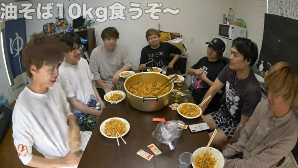 誕生日を迎えた凸のために10kgの油そば食べることになった畑メンバー。途中からはじめしゃちょーと、電話で呼び出したやふへゐ先生も参戦している。