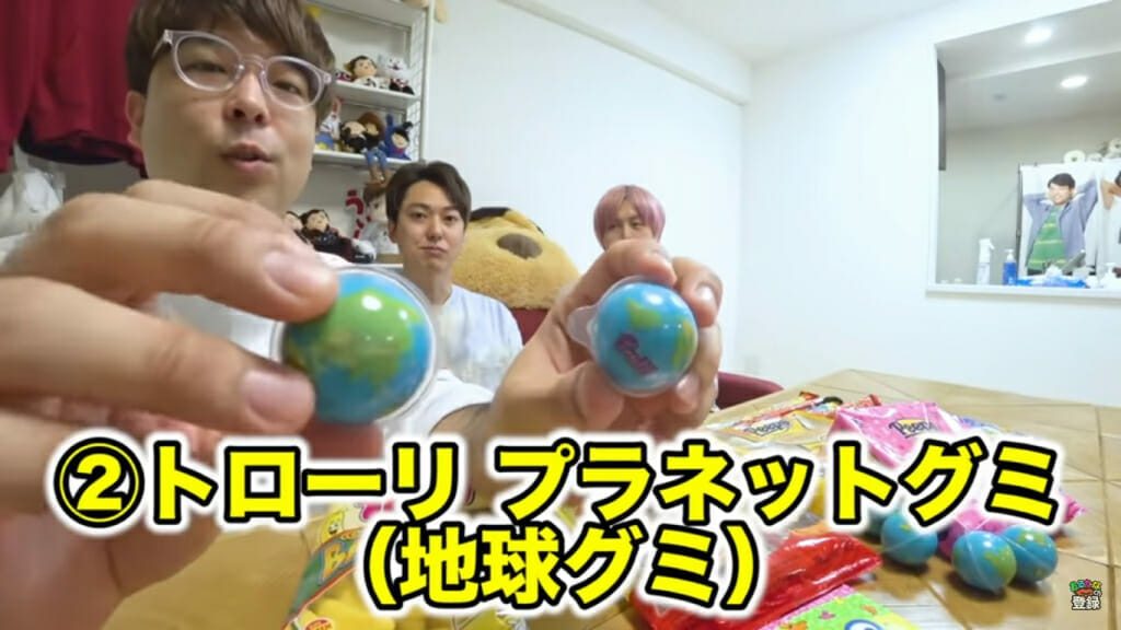 ないとー、渋谷ジャパン、タイガの3人は海外の変わったお菓子のレビューに挑戦した。バナナグミなど高評価を得たものもあったが、地球の形をしたプラネットグミには「あんまりうまくない」「暴力的な味」と辛口の評価を付けた。
