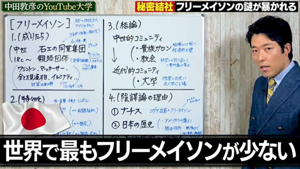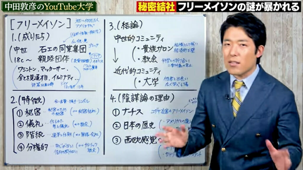 中田敦彦はフリーメイソンとは貴族サロンでも、教会でもなく勉強したい人が集まる大学だと説明。またユダヤとフリーメイソンは水と油の存在でないことも紹介した。日本でフリーメイソンの陰謀説があるのは、宗教的な事柄をタブー視しており歴史を学ぶことが出来なかったからと中田敦彦は語っている。