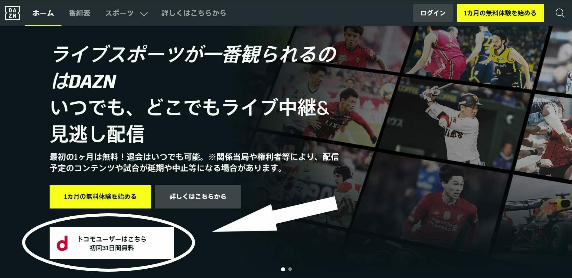 1.DAZN公式サイトのトップページで、「ドコモユーザーはここから」をクリックする
