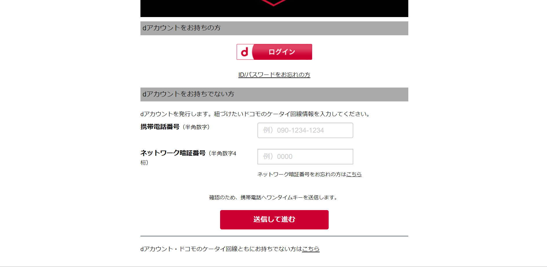 2.dアカウントが無い場合は携帯電話番号とネットワーク暗証番号を入力して送信