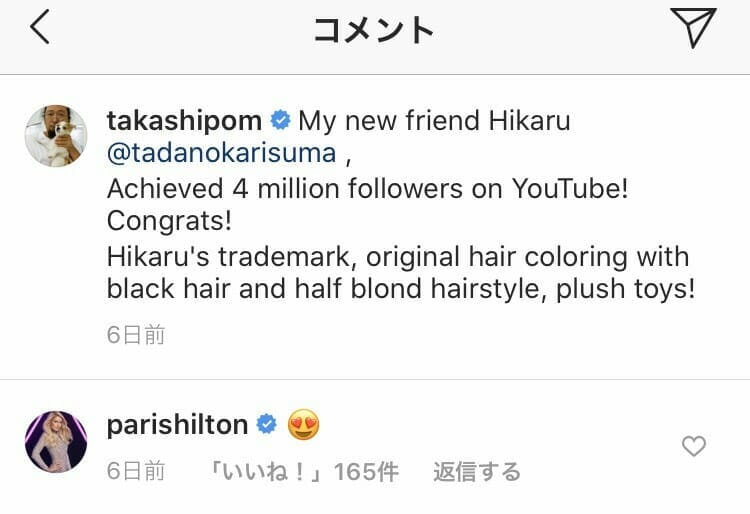 この投稿に対し、なんとあのパリスヒルトンが反応を寄せた。
