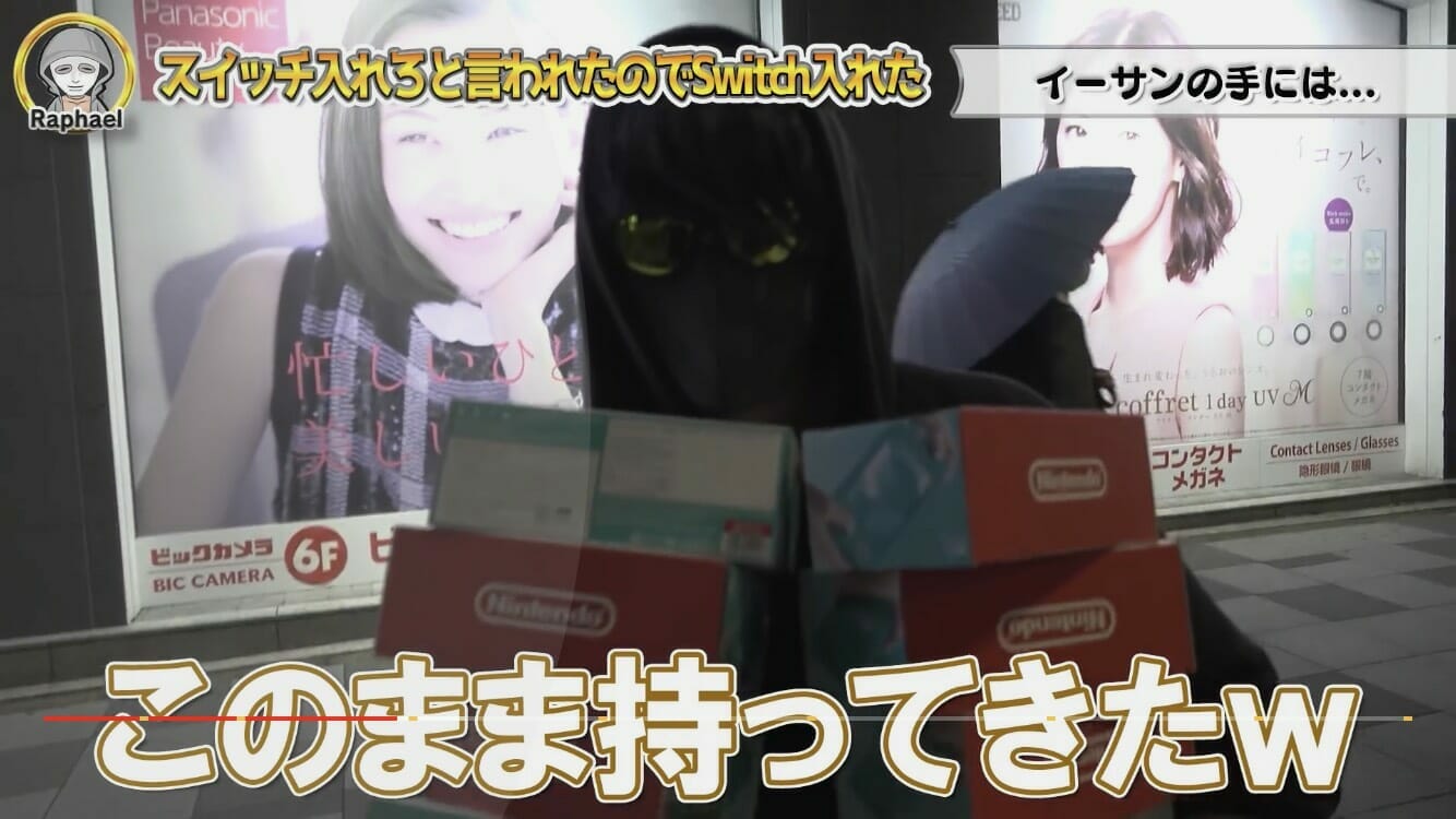 ラファエルがご飯を食べに行っている隙に、イーサンはビックカメラへニンテンドースイッチを買いに。入手困難だと言われているため長期戦になると思いきや、一店舗目のビックカメラでスイッチライト10台をゲット。