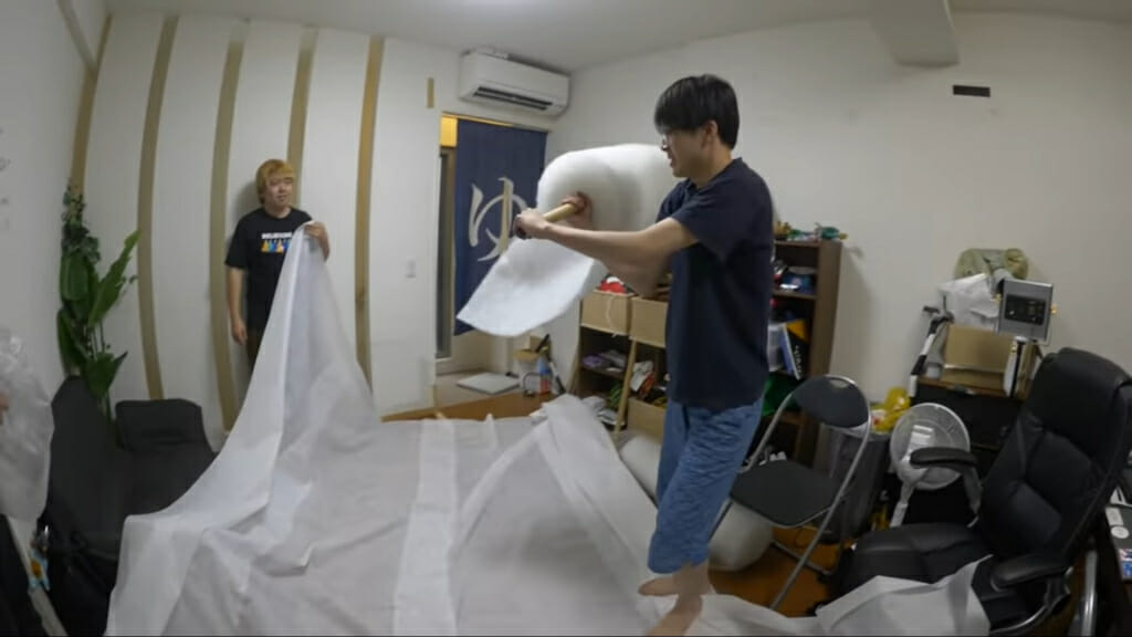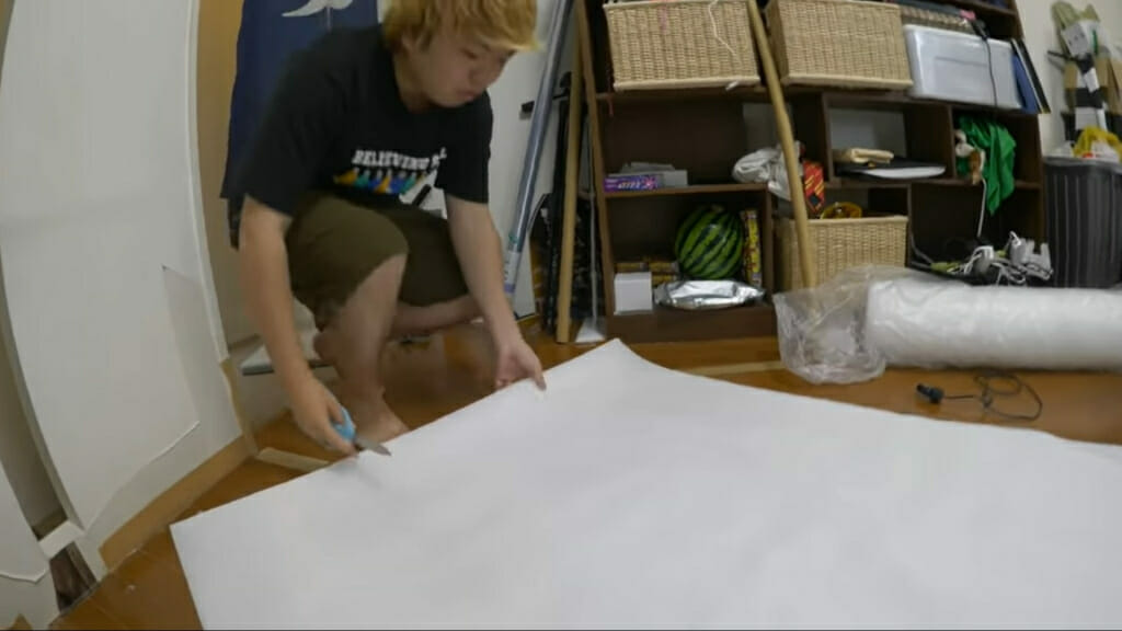 翌日が雨予報ということでてるてる坊主を作ることにした畑のメンバー。巨大な方が威力も大きいと、部屋いっぱいの白い布を手作業で縫い合わせていく。