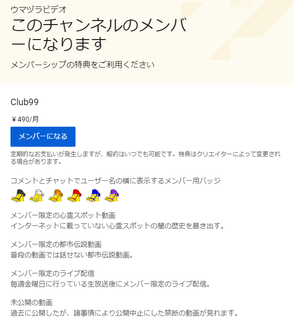 まず、今回ウマヅラビデオが「重大報告」と題して発表した内容のうち、一つは「メンバーシップの開始」だった。