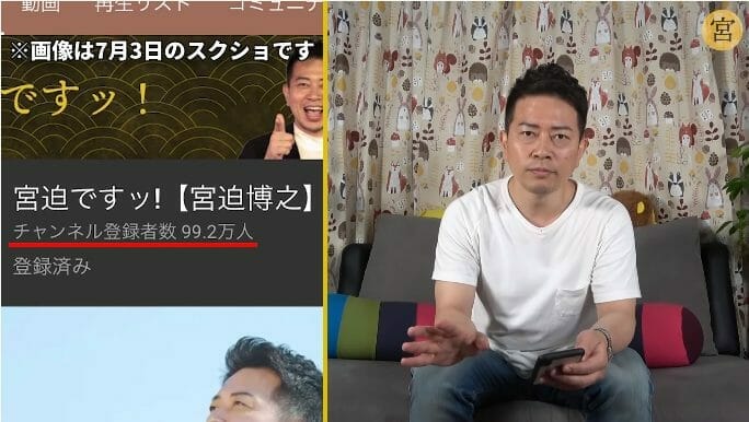 2020年7月5日、宮迫博之のYouTubeチャンネル「宮迫ですッ!【宮迫博之】」がチャンネル登録者数100万人を突破し、自身のTwitterで感謝とともに報告。