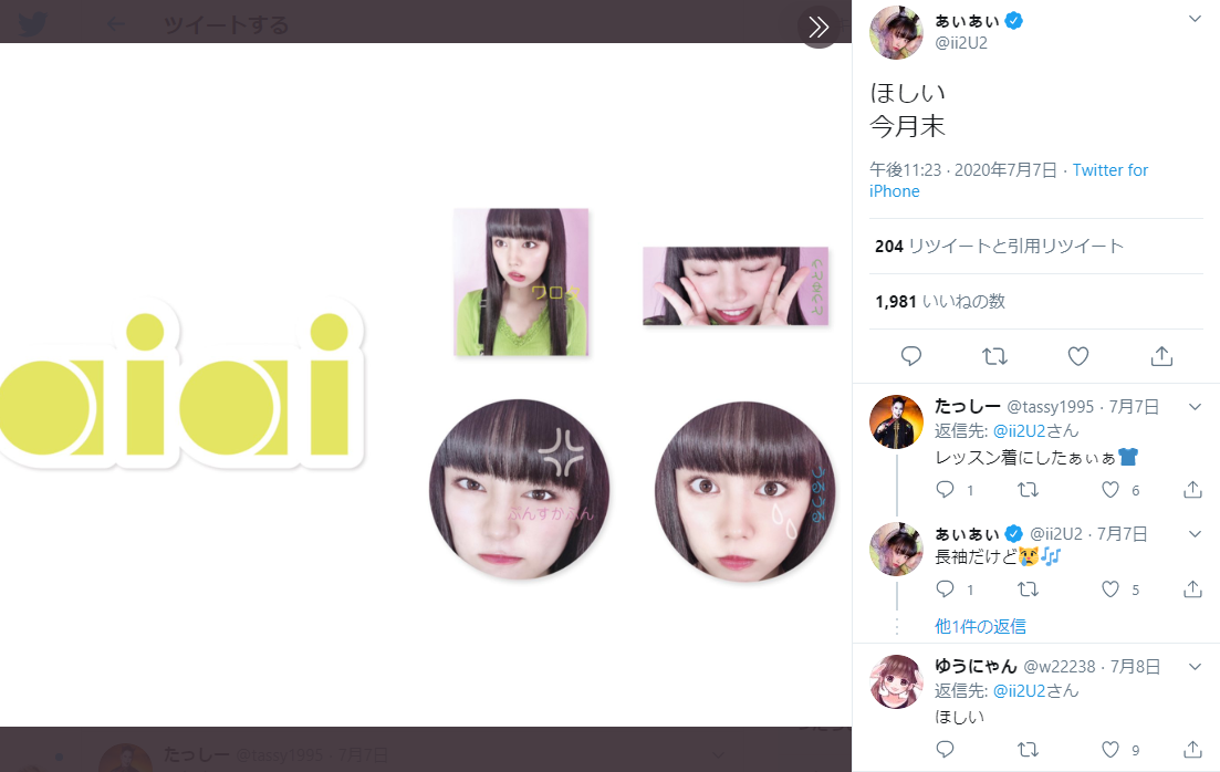 2020年7月7日、YouTuberとして活躍している、元アイドルの「ぁぃぁぃ」が、「ほしい 今月末」と言う文章をTwitterに投稿した。