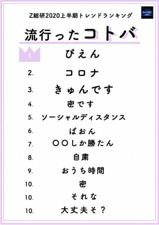 そして「流行ったコトバ」ランキング1位には”泣いた!”に変わって出てきた「ぴえん」がランクインしたものの、以降は「コロナ」「密です」「ソーシャルディスタンス」「自粛」「おうち」といった、新型コロナウイルス・外出自粛関連の言葉が並ぶこととなった。