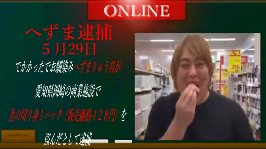 たっくーは、凸や迷惑行為で有名なへずまりゅうの二度目の逮捕に爆笑したと語った。報道によれば、愛知県岡崎市の商業施設で会計前に魚の切り身を食べたことを「盗んだ」とみなされ、逮捕されたという。以前、逮捕された時には「過激な行為をやめる」と言っていたへずまりゅうだったが、その後も続け、二度目の逮捕に至った。