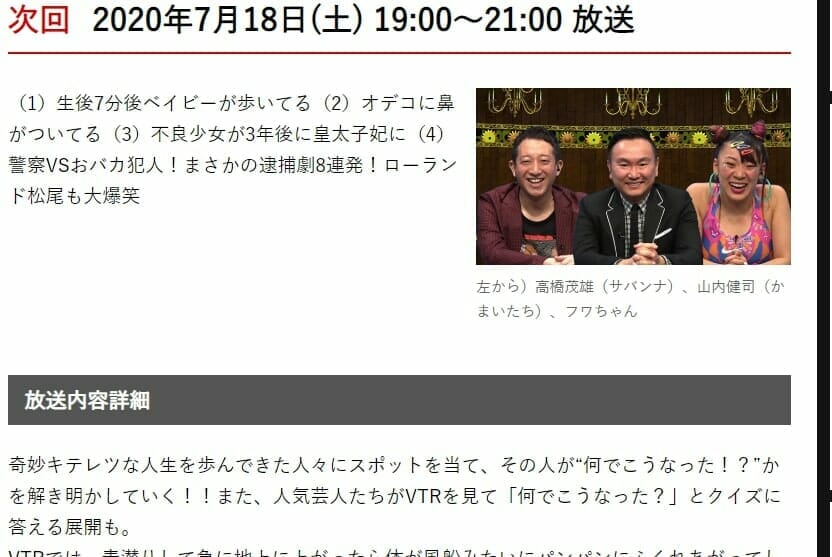 「衝撃映像30連発!」は奇妙キテレツな人生を歩んできた人が、なぜそうなったのかをVTRで見ていく番組。フワちゃんの他にも高橋茂雄(サバンナ)・せいや(霜降り明星)・山内・健司(かまいたち)・松尾駿(チョコレートプラネット)が出演する。