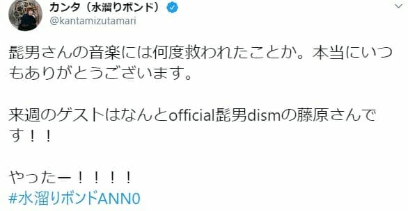 水溜りボンドのオールナイトニッポン0(ANN0)は、毎週木曜日の深夜に放送されている人気番組で、同番組にOfficial髭男ismのボーカルや作詞作曲を担当する藤原聡のゲスト出演することが発表された。この発表を受け、カンタは自身のTwitter上で「髭男さんの音楽には何度救われたことか。本当にいつもありがとうございます」「やったー!!!!」と喜びを爆発させた。