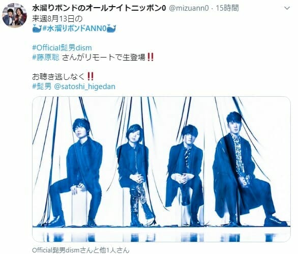 2020年8月7日、二人組YouTuberの水溜りボンドがパーソナリティーを務める「水溜りボンドのオールナイトニッポン0」に、Official 髭男ismの藤原聡が登場することが発表された。大物ゲストの登場に、ファンの間では「すごい!」との声が広がり、話題になっている。