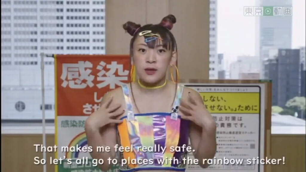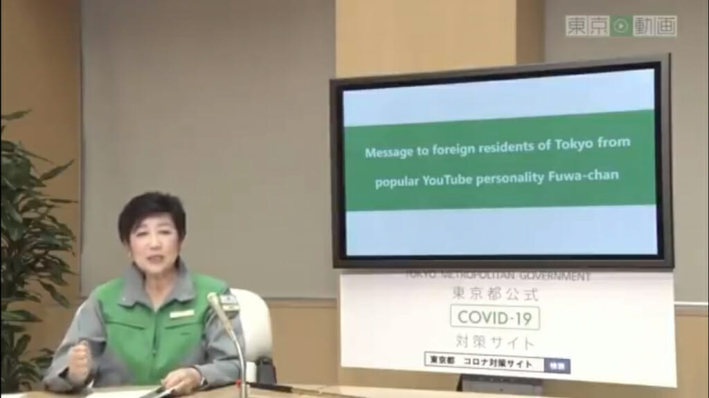 フワちゃんは、若者や外国人向けに虹のマークの感染拡大防止ステッカーの意味を英語で解説した後、マスクの着用を呼びかけた。動画の最後には、小池百合子都知事が登場し、こちらもペラペラの英語でメッセージを寄せたフワちゃんに感謝の意を示した。