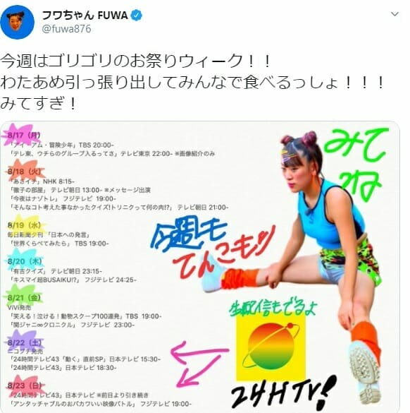 2020年8月17日、お笑い芸人でYouTuberとしても活躍するフワちゃんが、自身のTwitter上で7日間連続TV出演の情報を報告した。「ゴリゴリのお祭りウィーク!」と称して、生配信・新聞掲載を含む計15番組に出演する予定になっている。