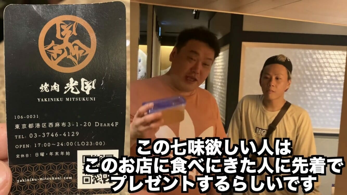 深田えいみから七味を回収したレペゼン地球は、知り合いの焼肉屋さんに七味唐辛子を提供した。無駄にすることなく、きちんと使う人に渡るようにしたことで、無駄にならずに済むこととなった。