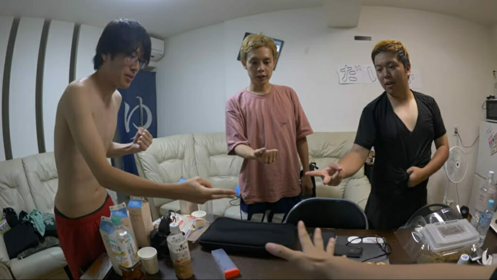 「トマトクン初っ端から裸で乳首にガムテープ貼ってるの草」