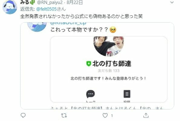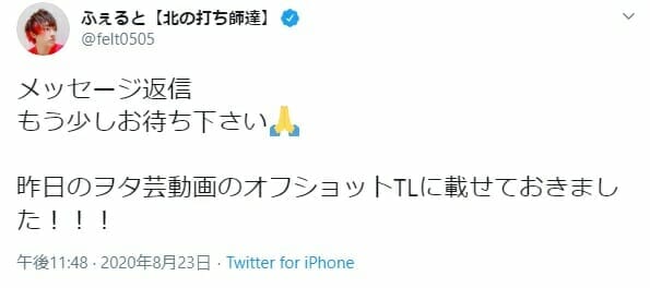公式LINE開設を発表した、北の打ち師達のふぇるとは、Twitterで「僕ら個人でLINEアカウントは何回か作って来ましたがついに公式です!最近LINE動かせて無かったですが、こちらの新アカウントでたくさん更新していくので登録よろしくお願いします」と登録を呼びかけた。多くの返信が寄せられたようで、ヲタ芸動画のオフショットもタイムラインに投稿したと加えてコメントした。