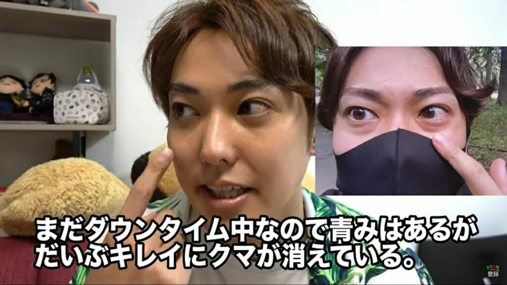 目の下のクマを気にしていたないとーは、そのクマを切除する整形手術を受けた。動画では整形外科の先生に手術内容を聞いている様子から術後の変化まで細かく、また分かりやすく説明している。手術から1週間後には渋谷ジャパンにも見せている。1~3ヵ月は腫れが続くそうだが、見た目はクマがなくなり、スッキリした印象になった。