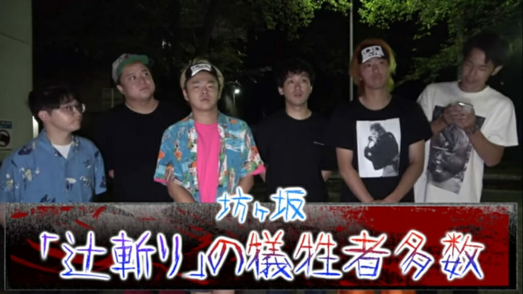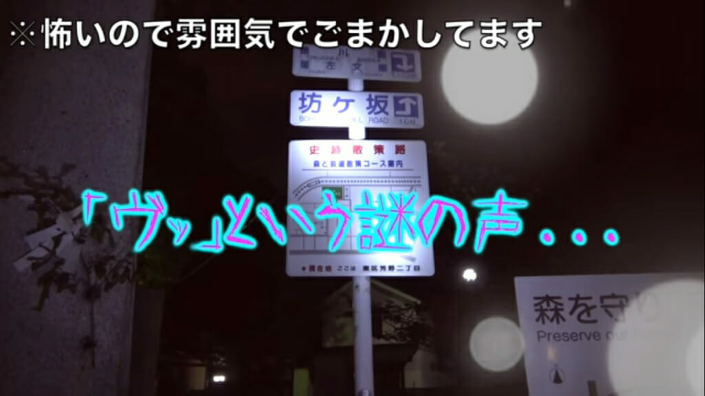 合計3か所の心霊スポット候補のうち、2番目の「坊ヶ坂」を訪れた東海オンエア。3人に分かれ、「坊ヶ坂」を踏破したところで、男性の「ヴッ」といううめき声が動画には収録されている。「坊ヶ坂」は辻斬りが多発していたところで、辻斬りに遭った人の苦悶の叫びかもしれないと編集ではまとめられている。しかも、動画の最後で、心霊スポットとして実際に認知されている場所であることが分かり、より恐怖感が増している。