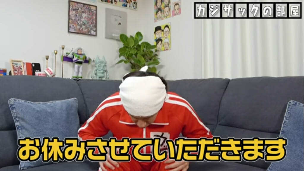 2020年9月7日、芸人でYouTuberとしても活躍するカジサックが「【ご報告】しばらく動画お休みします」という動画を投稿した。少し遅い夏休みをとり、9月8日から13日まで動画投稿を休止すると報告した。また、復帰明けの14日(月)には「とんでもない動画」を投稿すると予告した。