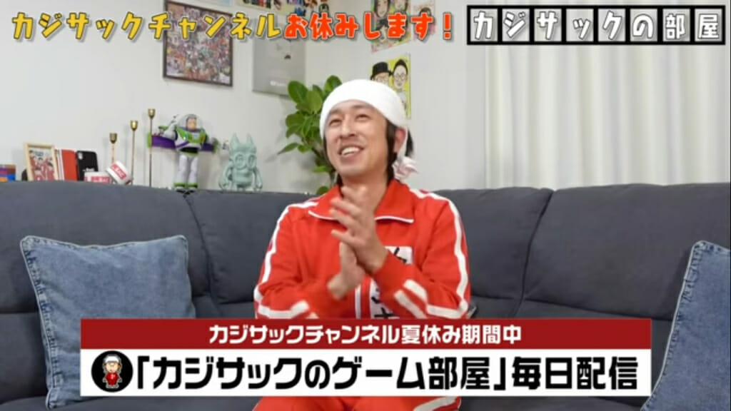 カジサックは、編集スタッフやトンボを含むチームカジサックが9月8日から一時活動休止に入ることを報告した。理由は、「夏休み」のためで、期間は13日までの6日間となる。この間は、メインチャンネルとサブチャンネルの「カジサックの小部屋」も投稿休止となるが、ゲームチャンネルではヤスタケと新規加入の女性スタッフによる毎日配信を行う予定だ。