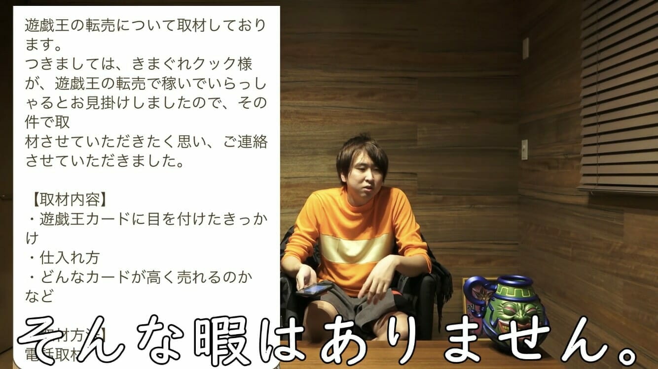 俺が遊戯王転売で稼ぎまくってるのを取材させてくれとのこと。