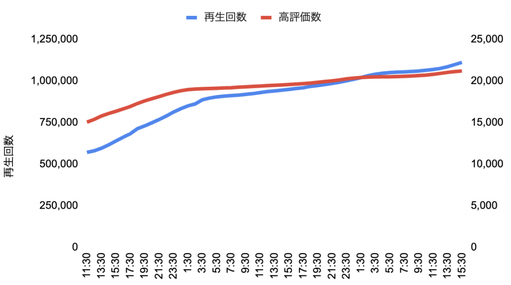 27日の深夜には100万再生突破した様子がグラフから見てとれる。