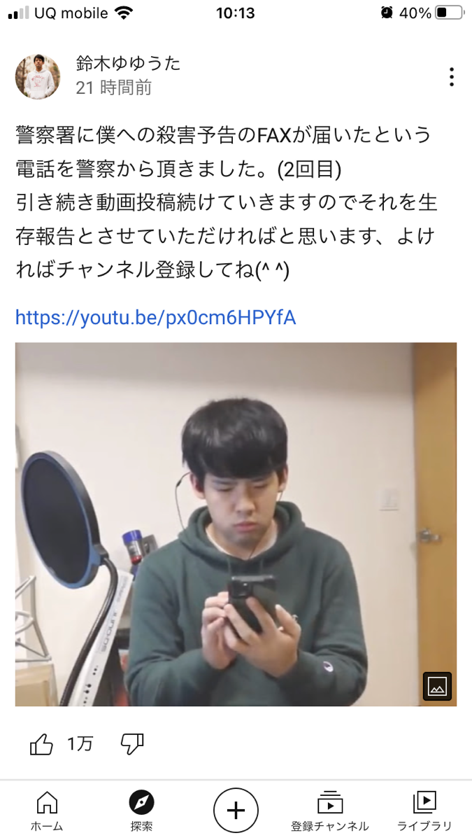 警察から連絡を受け、本日18時に鈴木 悠太を殺すといった内容の殺害予告のFAXが届いたとのことで、「鈴木さん大丈夫ですか?」と確認されたという。