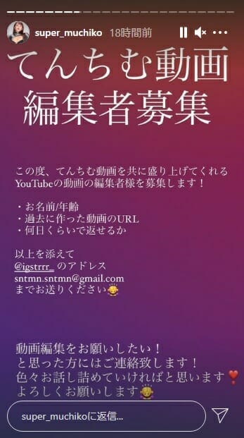 てんちむ インスタのストーリーにてYouTubeの動画編集者を募集