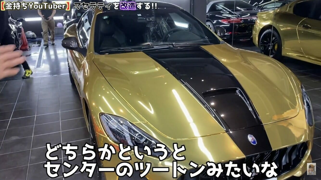 ヒカルは今回、リリースした楽曲「俺達金持ちYouTuber」にかけて、金持ち仕様のマセラティに塗装する企画を実行。プロにお任せし、ダサくならない程度の金色と黒色のヒカルカラーマセラティに改造した。