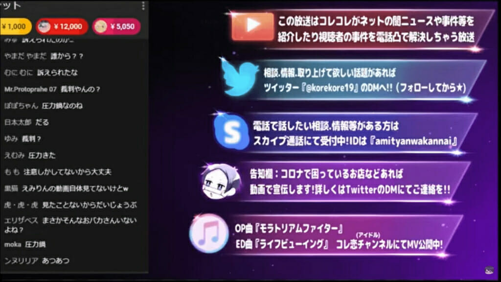 2020年1月12日、コレコレが「【緊急生放送】へずまりゅうから皆さんへ重大発表、エミリン謝罪後完全逃亡…イケカテ配信者から被害を受けた女子高生がやばい…亡くなった母のiPhoneパスワードを視聴者で考察」を生配信。生放送中にコレコレがメインで使用しているTwitterのアカウントが凍結したことを報告し話題になっている。