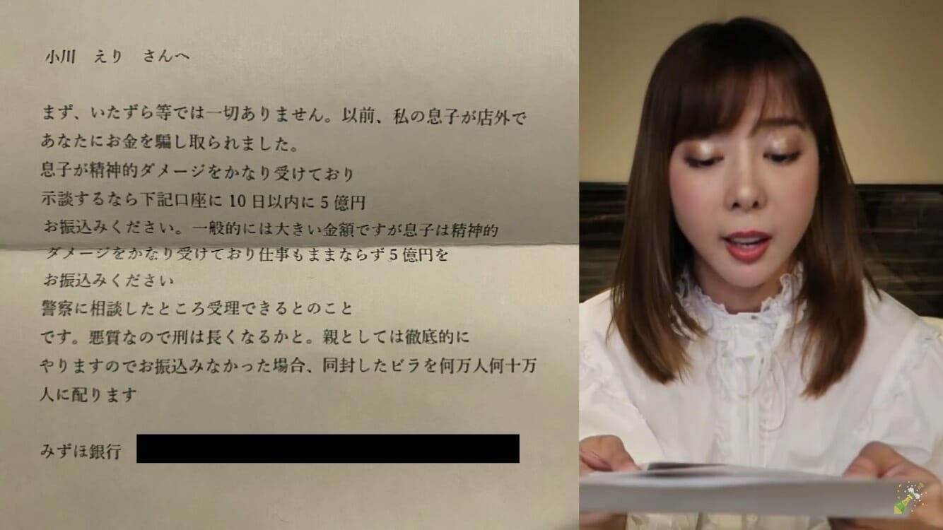 脅迫状の中には、「息子があなたに騙された。10日以内に5億円振り込め」という内容だった。また、警察にも受理してもらえるとの記載も。