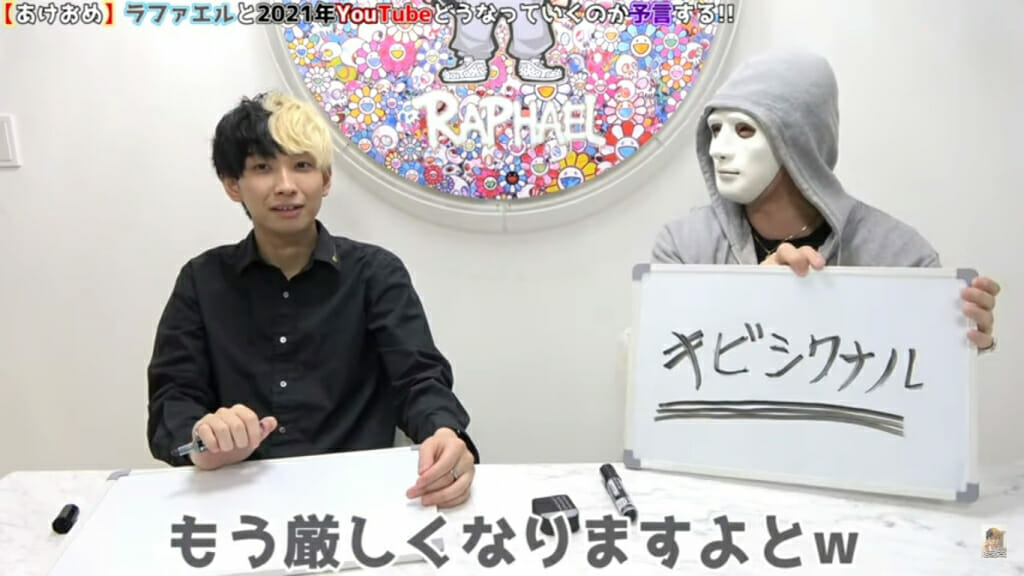 2021年のYouTube事情を予想したラファエルは、もうそろそろYouTuberとしてのビジネスが「キビシクナル」と予想した。ヒカルは、YouTuber大手事務所の崩壊を予想したが、具体的な名前はモザイクで隠されている。ヒカルによると、プロダクションビジネスが崩壊し、エージェント形式が主流になってくると予言した。
