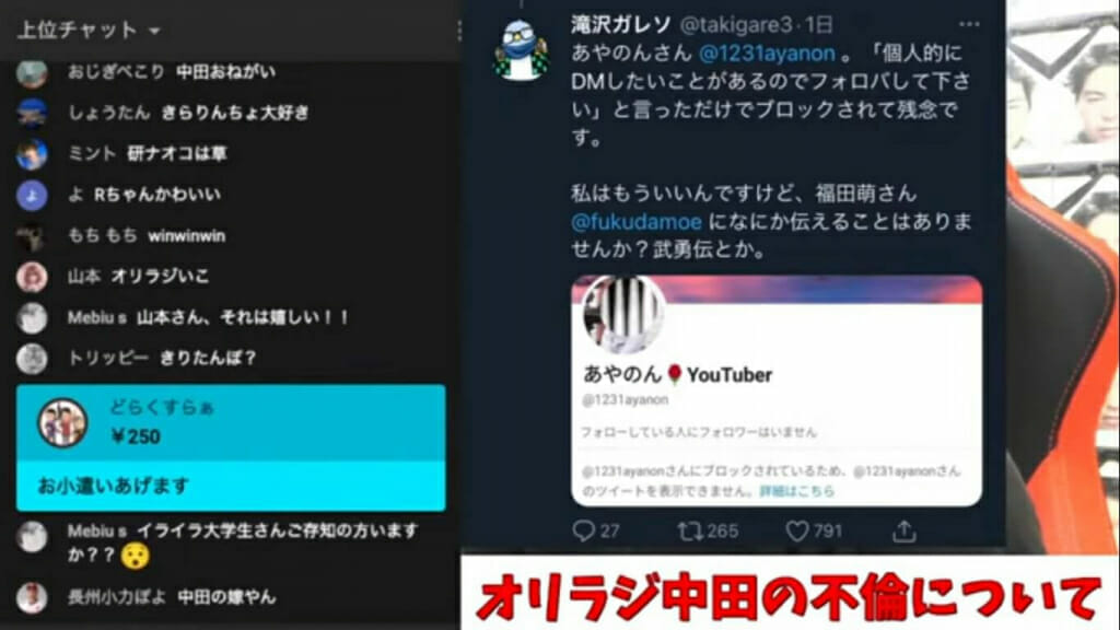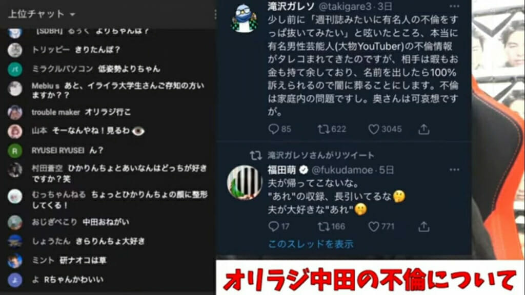 よりひとは、オリラジ中田敦彦の不倫疑惑を匂わせる有名ツイッターユーザーのツイートを自身のライブ配信中に紹介した。ツイートによると、不倫疑惑のある相手は「あやのん」名義でYouTubeでの活動も行っていたとみられている。