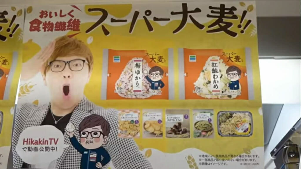 ヒカキンがコラボしたのは、ファミマの「スーパー大麦バーリーマックスおむすび」で、ファミマの制服を着たヒカキンくんがプリントされている。他にも、スーパー大麦入り食品がある陳列棚には、ヒカキンのPOPが設置され、店内放送にも登場している。