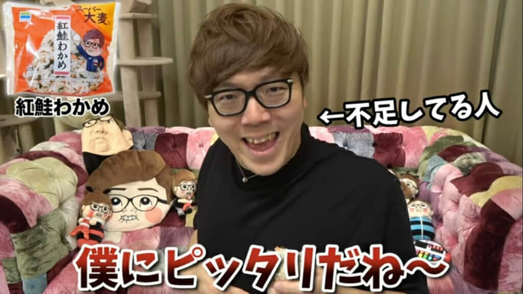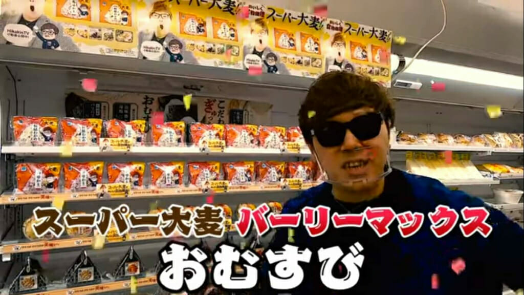 食物繊維がたくさん含まれたおにぎりを実食し、コラボ商品をアピールしたヒカキンに対し、