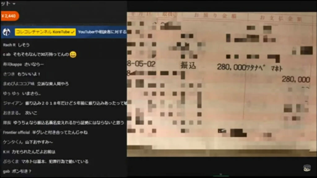慰謝料を支払った山下威豆三だったが、5年前にマホトから口止めを依頼され、慰謝料を返還してもらったと話した。その証拠として、返済されたお金28万円を示す通帳画像が公開された。振込元の名前は「ワタナベマホト」という氏名が記載されている。