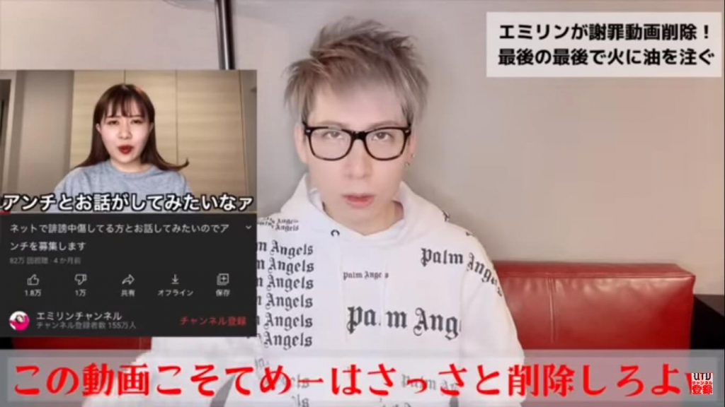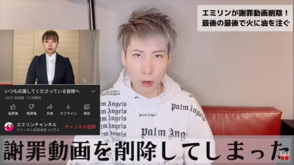 スタッフのTくんとの匂わせ言動や不倫疑惑について動画で謝罪したエミリンだったが、謝罪動画が削除されていることが判明した。物申す系YouTuberのU-Twentyは、黒歴史を消したかったのではないかと推測した。