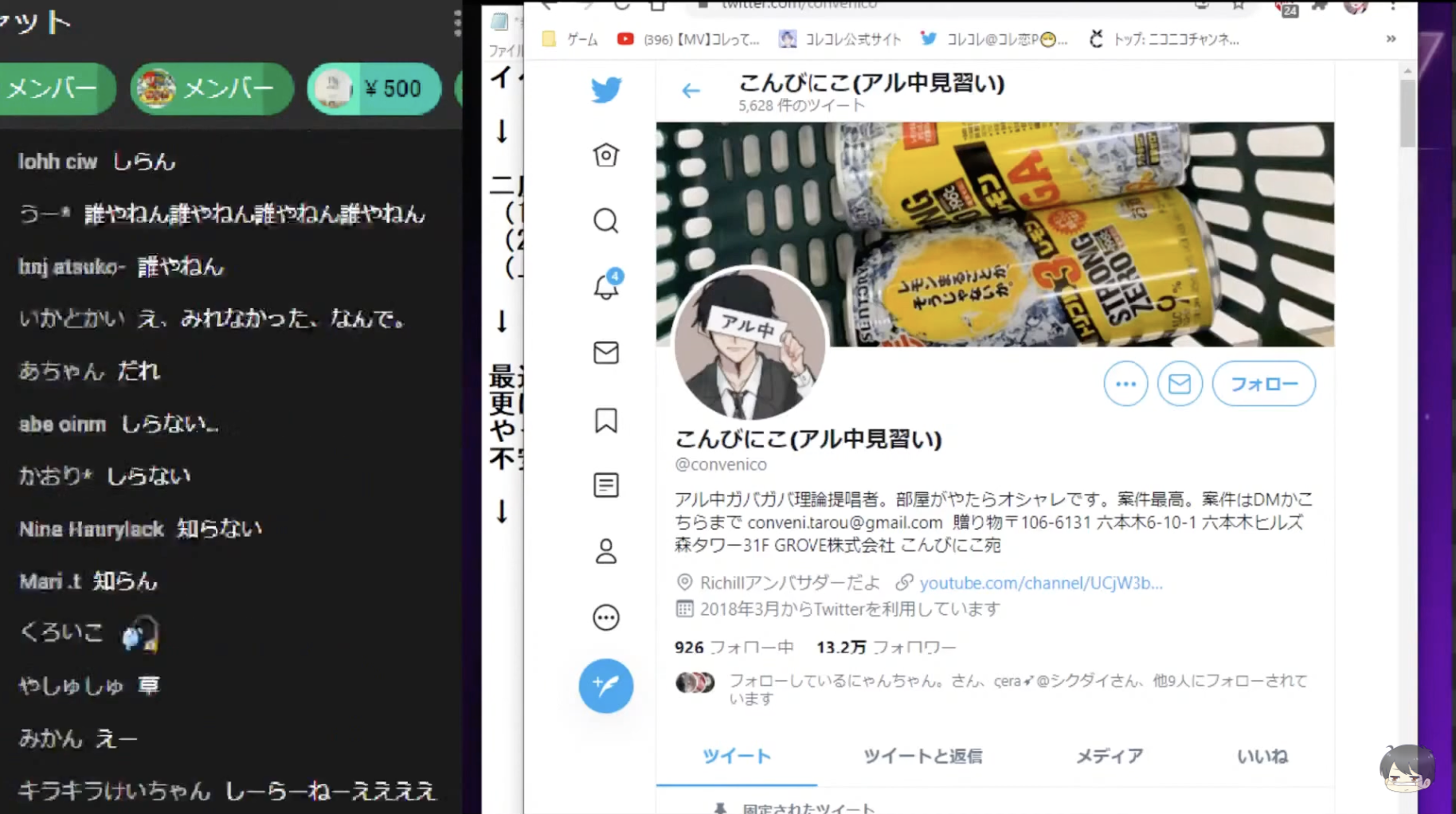 5月7日夜、「コレコレ」がおこなったYouTube生配信にて、ある女性からのタレコミがあった。それは、こんびにこと肉体関係をもったという女性からだった。女性によると、こんびにこと関係を持ったのは3年前で、女性は当時18歳の未成年だったそうだ。こんびにこに無理やりホテルに連れて行かれ、同意なしに性行為をされ、無許可でその様子を撮影されたとのことだ。